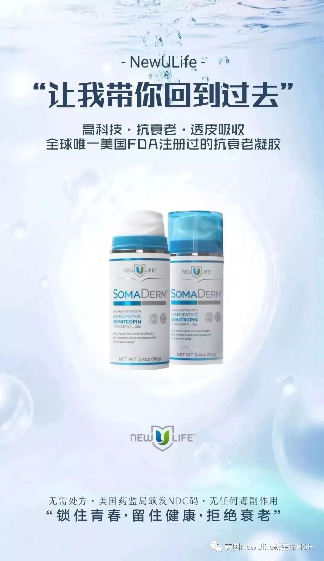 新生命 (New U Life) 推出的 SOMADERM 抗老凝膠是嚴格使用順勢療法理論及技術稀釋主要成分製作的凝膠 (Homeopathic HGH),絕對不是類固醇,100%安全,經美國FDA註冊,不需醫生處方,而且透過皮膚吸收直接到達血液中,再深入到細胞層,是同類產品中最有效用的。