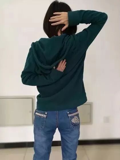 、左手向上置于后脑处右手向下置于肩胛骨处。