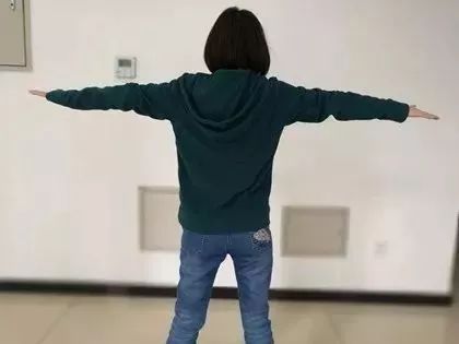 、双脚打开将右手放于后脑处将左手放肩胛骨中间位置(够到肩胛骨可以放到腰间)。