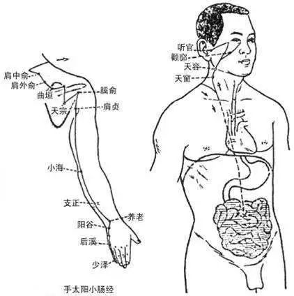小肠经最佳探查、疏通时间下午-点钟按揉后溪穴、天宗穴点揉肩贞穴探查如有疼痛可痛点处点、按揉分钟。