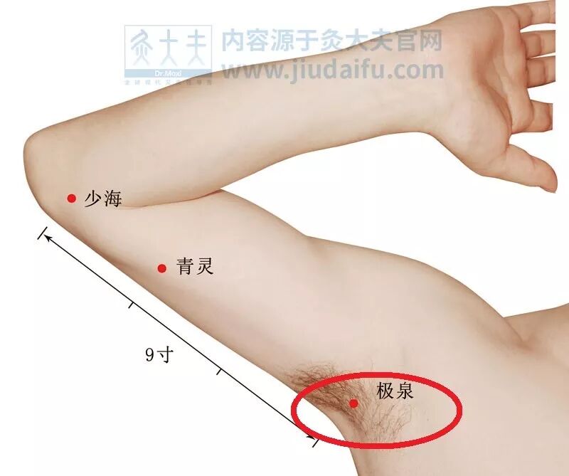 极泉穴仅具有宽胸理气作用还可以快速回阳引血上行使头脑快速清醒。