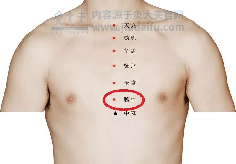 膻中也解郁穴。日常生活中如果们被气着经常会自觉地拍打自己胸膛实际上这就拍打膻中穴。