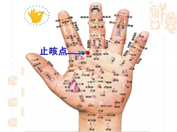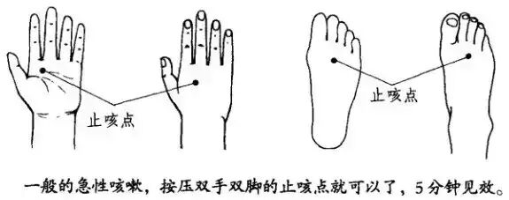 止咳点手上手掌上有个手背上与之对应地方还有个脚上与手相对应地方也可以找到咳嗽高升点般急性咳嗽按压双手双脚这几个点可以分钟见效。