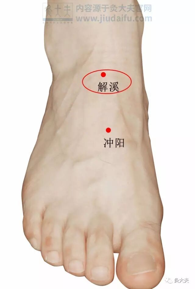 解溪穴:脚背、踝关节活动的凹点。这个穴位是全身祛痰湿的穴位,对解除下肢的水肿效果较好,每日艾灸20~30分钟。