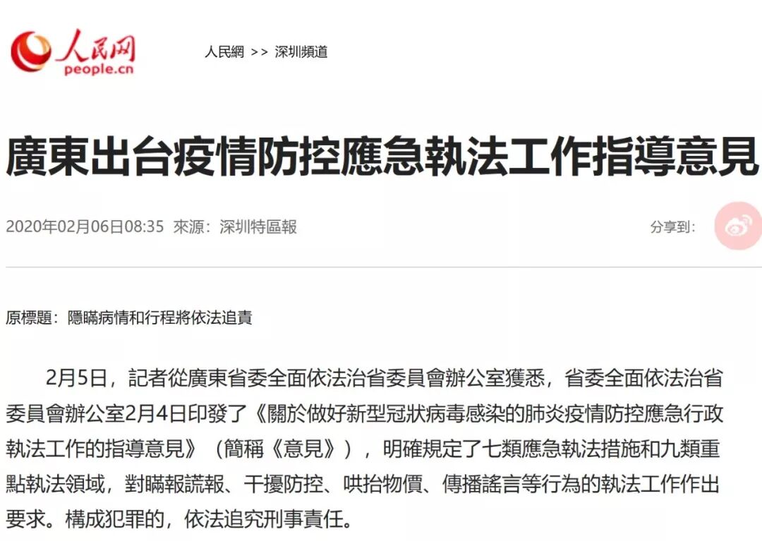 日前,广东省委全面依法治省委员会办公室印发《关于做好新型冠状病毒感染的肺炎疫情防控应急行政执法工作的指导意见》,明确对瞒报谎报依法追究责任。