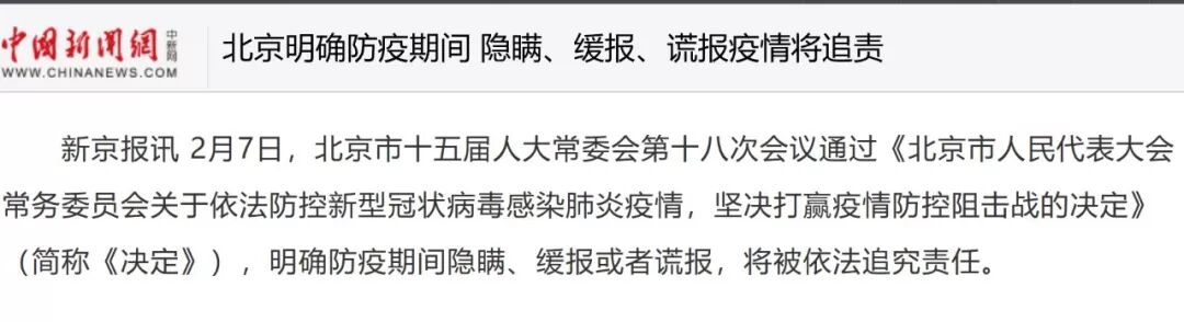 北京市人大常委会第十八次会议近日审议通过了《北京市人民代表大会常务委员会关于依法防控新型冠状病毒感染肺炎疫情,坚决打赢疫情防控阻击战的决定》。明确防疫期间隐瞒、缓报或者谎报,将被依法追究责任。