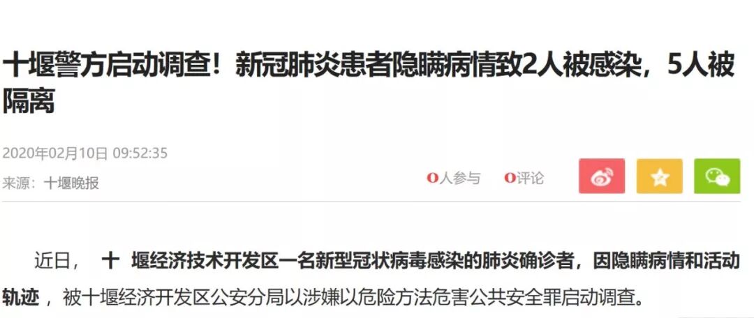今天报道,十堰经济技术开发区一名63岁的新冠肺炎确诊者,因隐瞒病情和活动轨迹 ,被十堰经济开发区公安分局以涉嫌以危险方法危害公共安全罪启动调查。