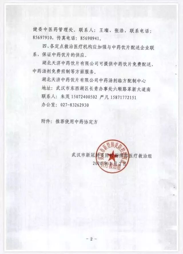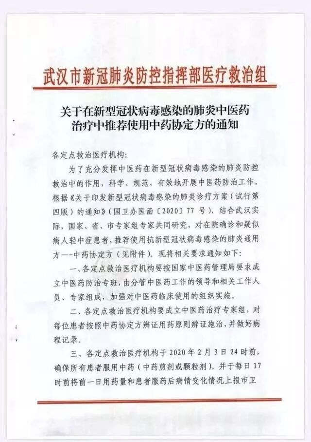 2月2日,武汉市新冠肺炎防控指挥部医疗救治组印发《关于在新型冠状病毒感染的肺炎中医药治疗中推荐使用中药协定方的通知》。《通知》强调,武汉市各定点救治医疗机构于2020年2月3日24时前,确保所有患者服用中药(中药煎剂或颗粒剂)。