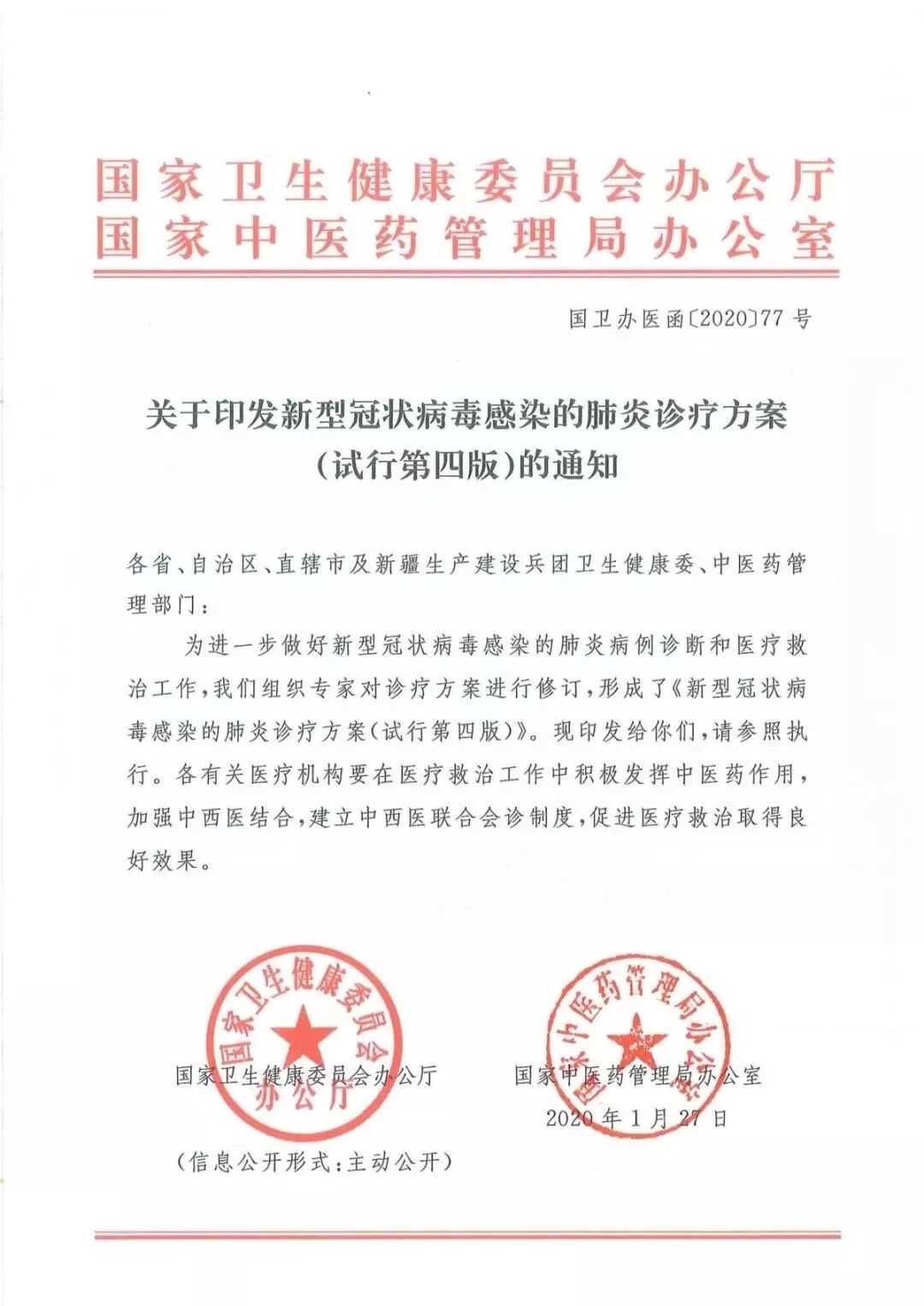而早在1月27日,国家卫健委联合国家中医药管理发布《新型冠状病毒感染的肺炎诊疗方案(试行第四版)》,要求各有关医疗机构要在医疗救治工作中积极发挥中医药作用,加强中西医结合,建立中西医联合会诊制度,促进医疗救治取得良好效果。
