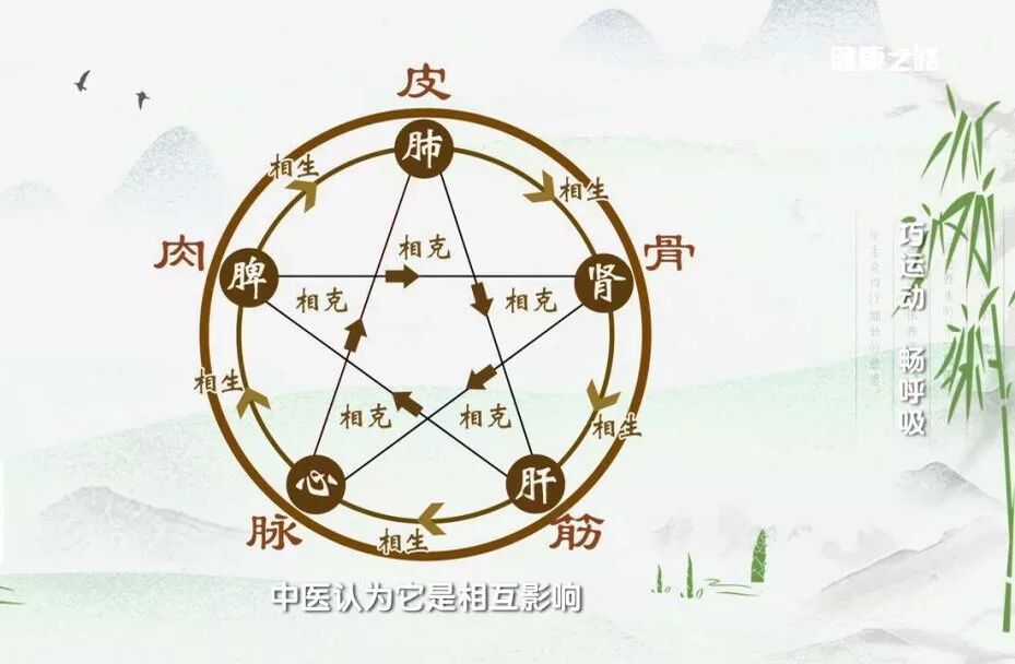 五脏即心肝脾肺肾,五体即脉筋肉骨皮。脉通于心;筋通于肝;肉通于脾;肺通于皮毛;骨通于肾。人在呼吸时,不仅肺脏在运动,全身的毛孔也在帮助呼吸。正如:骨骼与肾相连,关节不好或骨质疏松时要补肾。