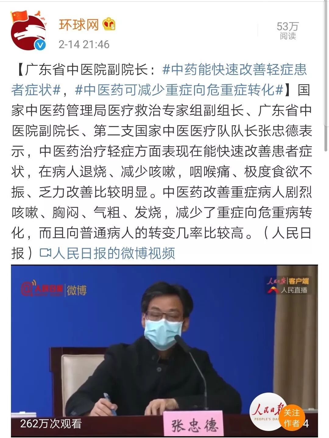国家中医药管理局医疗救治专家组副组长、广东省中医院副院长、第二支国家中医医疗队队长张忠德表示:显示出很好的疗效!