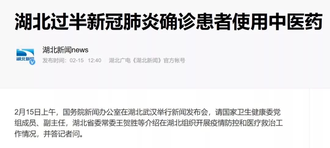 据新京报报道,国务院新闻办公室2月15日在湖北武汉举行新闻发布会。国家卫生健康委党组成员、副主任,湖北省委常委王贺胜介绍,救治患者中西医结合是此次疫情救治的一大特色,湖北地区一半以上确诊患者使用了中医药。