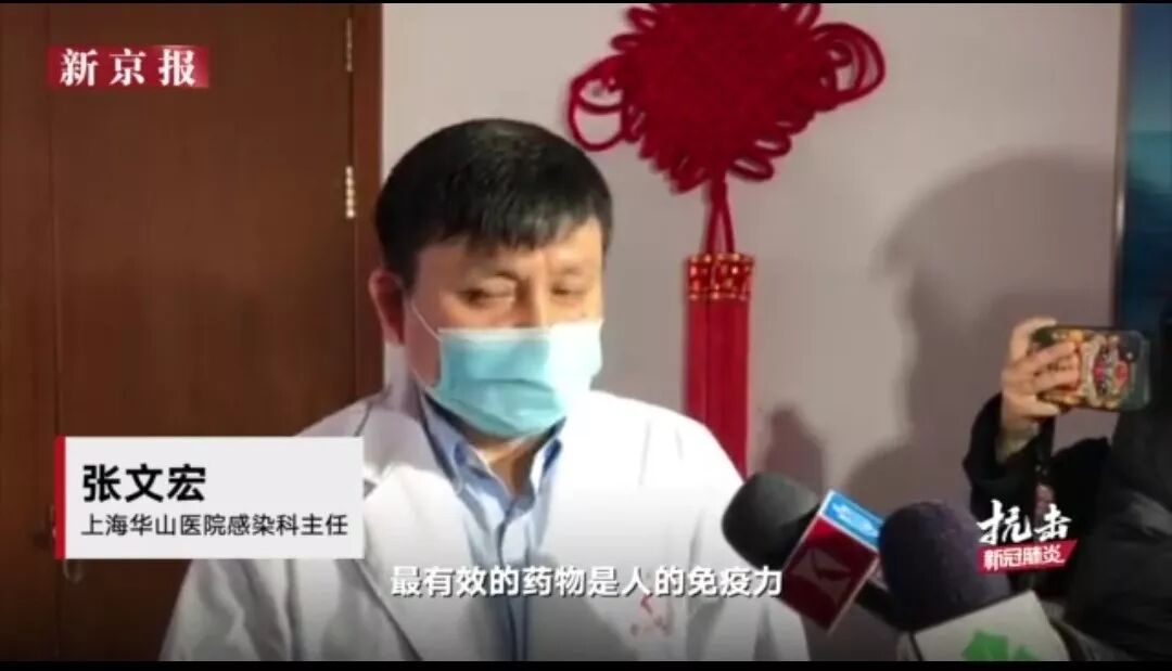新京报报道,复旦大学附属华山医院感染科主任医师张文宏在接受媒体采访时就谈到,最有效的药物就是免疫力。