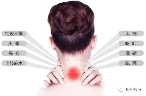 颈部酸胀、僵硬、困疼,中后期颈椎病压迫脑部⾎管、神经根、脊髓等周边组织,会引起头痛、头晕、恶⼼、呕吐、肢体发麻、持物不稳 等病症。严重病例会出现休克、猝倒以及瘫痪