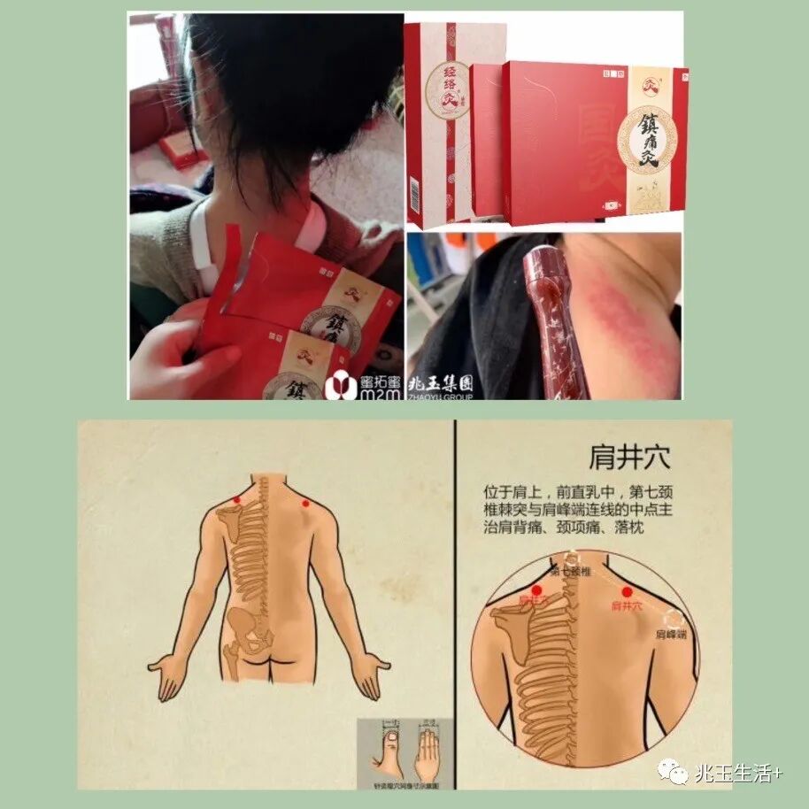 半小时或一小时后,镇痛灸(或颈痛灸)贴敷阿是⽳(即:局部疼痛点) 贴敷肩井⽳或⼤椎⽳