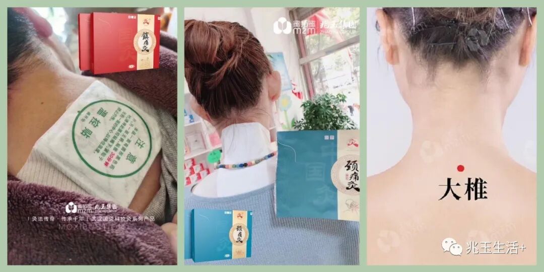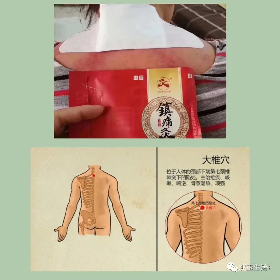 半小时或一小时后,镇痛灸(颈痛灸)贴敷⼤椎⽳ 或阿是⽳(即:局部疼痛点)