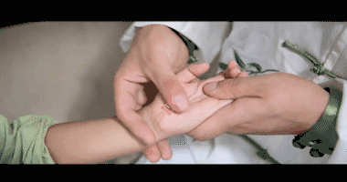 作用一只手托住孩子的手掌,暴露桡侧缘,然后用另一只手的拇指螺纹面从孩子手掌虎口推向食指指尖。