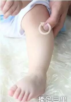 (7)按揉足三里:术者拇指端或罗纹面着力,稍用力按揉200次。