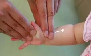 (5)推三关:术者以拇指桡侧面或食、中指腹自腕横纹推向肘,推300次