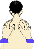 操作者双手四指轻轻扶住宝宝背部的两侧,双手拇指沿肩岬骨内侧由上向斜下方推,力量均衡柔和,速度为每分钟100次。每次操作1-5分钟不等,也可以根据情况适当延长时间。