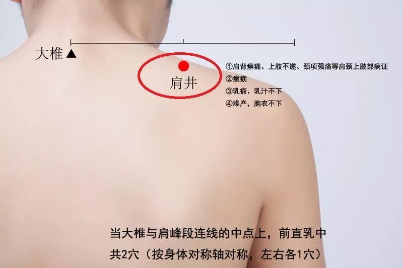 肩井位于大椎与肩峰连线之中点,肩部筋肉处。