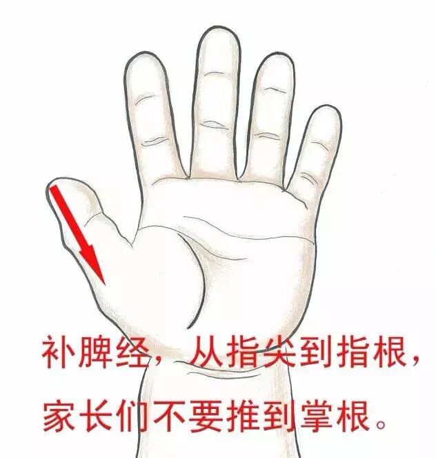 从大拇指桡侧从指尖向指根推是补脾经,300次,有健脾益气的作用。