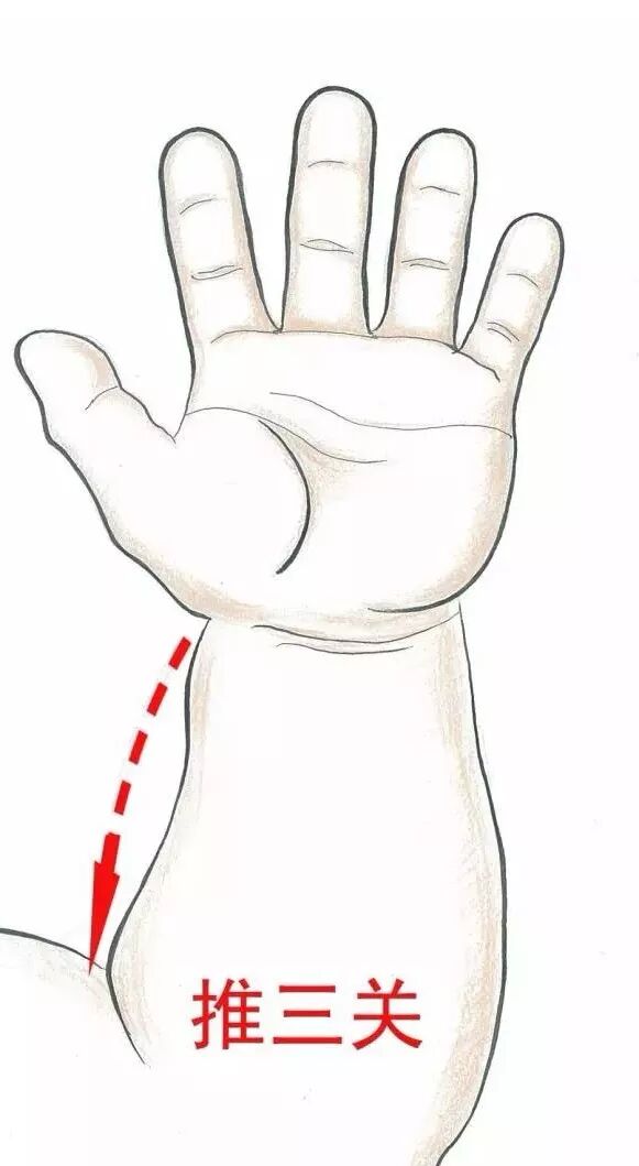 宝妈们记住,推三关这个手法就相当于热水袋,它有益气行血、温阳散寒的作用。主治一切虚症。是一个温阳的大穴,顺着大拇指一侧从手腕向手肘推就是推三关,150次即可。