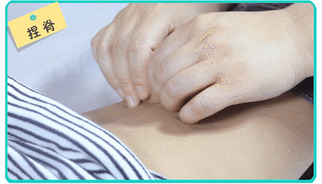 1、捏脊:如下图,推拿者双手的大拇指在下,食指、中指、无名指在上,轻轻捏起宝宝脊柱处的皮肤,沿脊柱自下向上两手交替捻动,可做5到10遍。