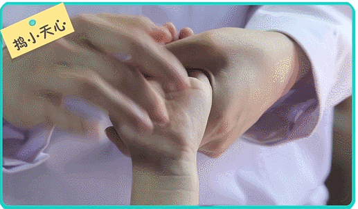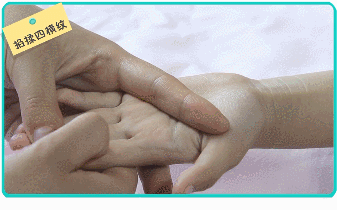 推拿方法:推拿者用拇指指尖,从宝宝的食指开始轻轻掐揉四横纹,掐1下、揉3下,逐个手指操作,共做3到5遍。