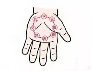 内八卦位置:如下图,以手掌中心为圆心,以圆心至中指指根横纹约 2/3 处为半径,画一圆圈,八卦穴即在此圆圈上。对腕横纹中点者为坎,对中指者为离,在拇指侧中点为震,在小指侧中点为兑,共八个方位。可以调理宝宝乳食内伤引起的腹胀、呕吐等症状。