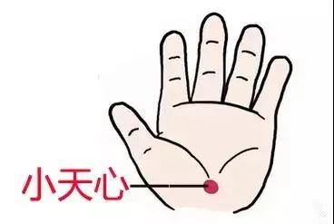 推小天心:推拿者食指或中指屈曲,指尖快速按宝宝下图中的位置,此位置有一个凹陷处。