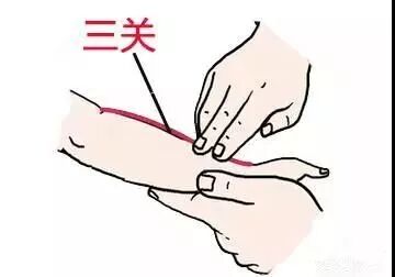 三关穴位置:前臂桡侧,从腕横纹至肘横纹成一直线。