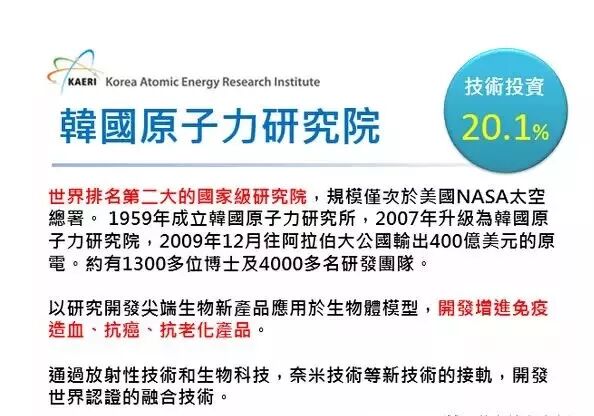 韩国原子力研究院是韩国政府出资成立的科研机构,拥有1300多名博士和4000余人的研究团队。掌握抗癌防辐射的专利配方和天然化妆品的提纯技术。这个机构的研究经费都是来自韩国政府,公司少了这笔研究费用,降低大笔的成本。