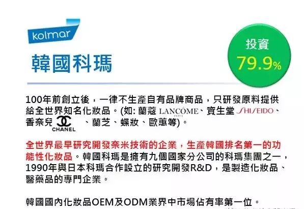 科玛(KOLMAR)公司是全球最大的化妆品原始设计和生产商。为众多世界知名化妆品牌如香奈儿、兰蔻、雅诗兰黛、蝶妆、兰芝、资生堂、欧惠、SK-2、欧莱雅、强生等提供设计和加工服务。