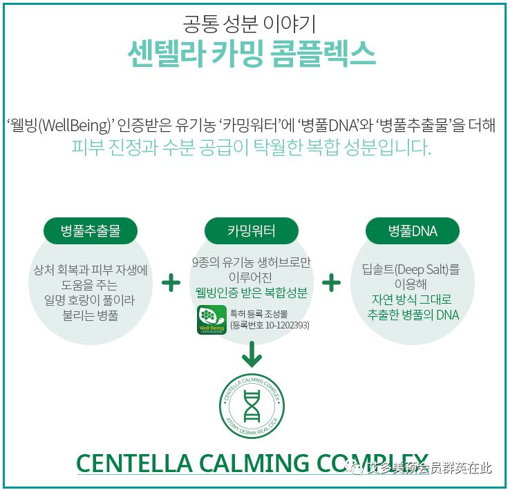 Centella Calming Complex——结合积雪草萃取物+镇定植物水+积雪草核心提取物,形成积雪草镇定复合有效成分