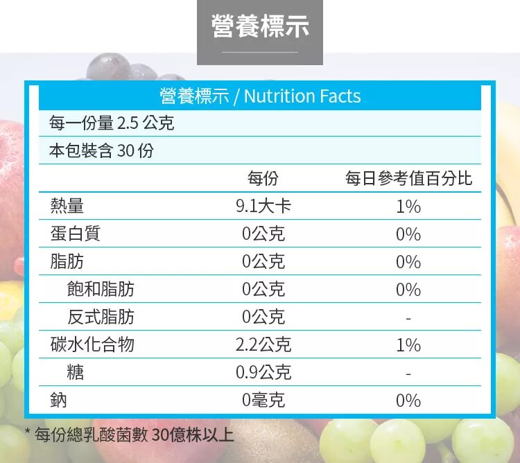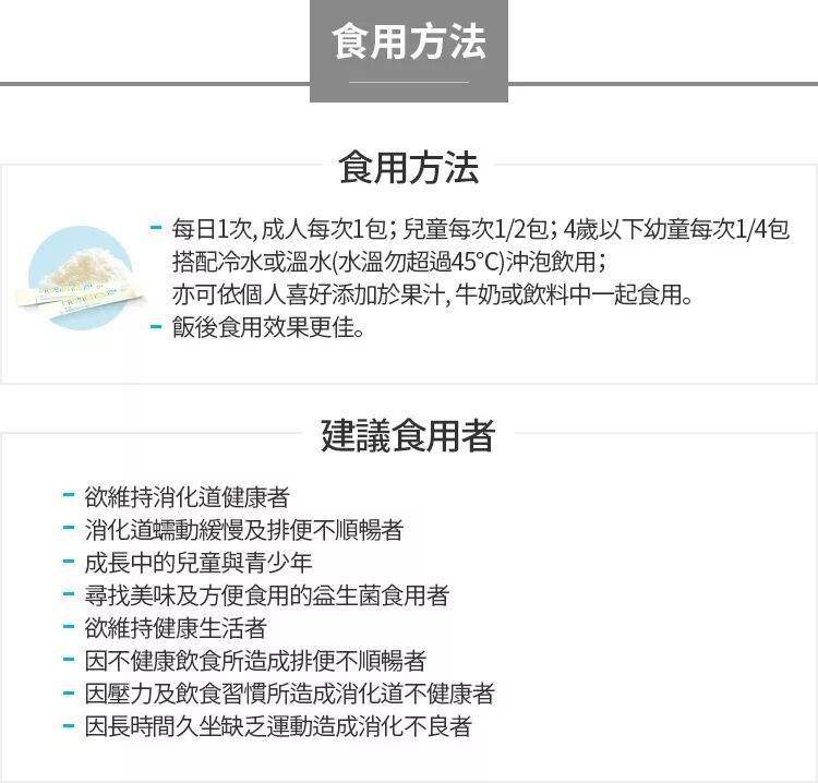 1. 包含30億活性益菌,包括乳酸桿菌及隻岐桿菌,益菌的營養來源,促進益菌在腸內繁殖。