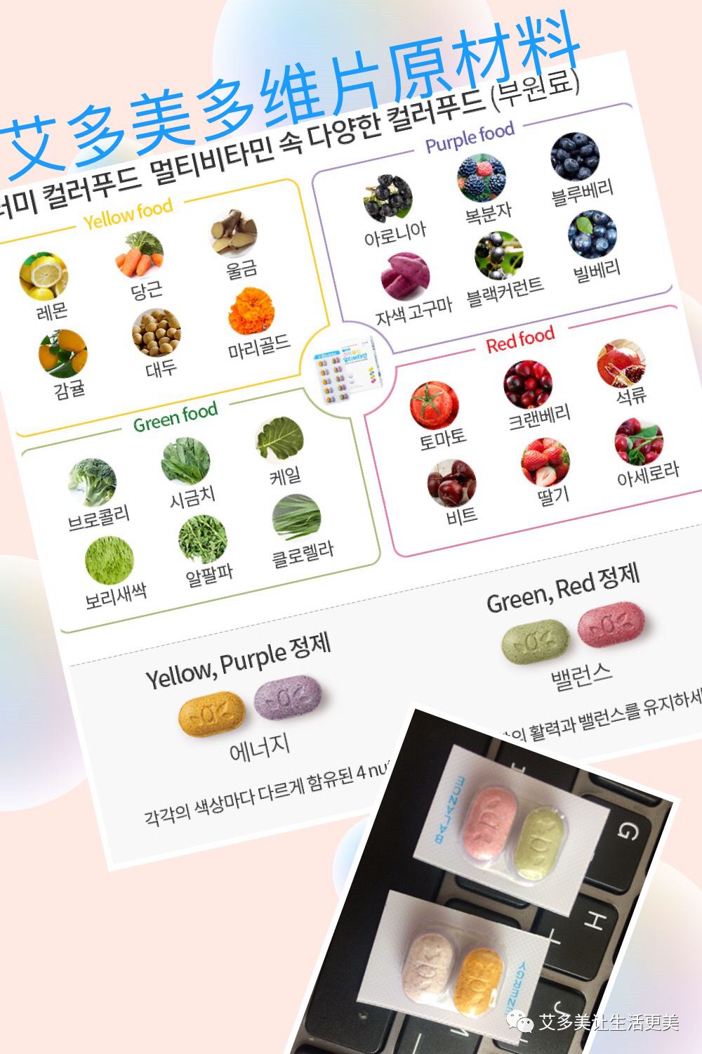 多维片含有13种维生素9种矿物质,每天四种颜色的植物的摄取满足每天所需。