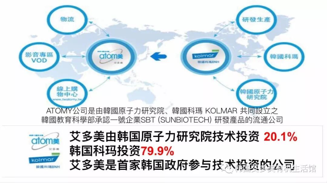 韩国原子力研究院和韩国科玛联合成立了一家公司就是Kolmar BNH,由SBT推出的产品系列,就是艾多美(英译Atomy)。由原子力研究院主要负责研发,科玛负责研发和生产。