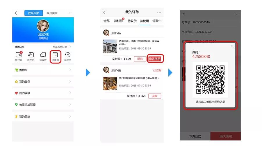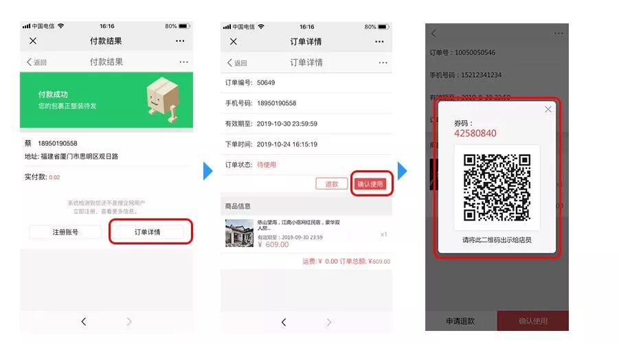 2.未注册用户:在购买后点击订单详情或找到购买时系统发送的订单信息—>在商品详情中选择“确认使用”—>将二维码出示给店员核销