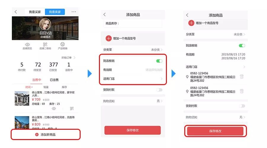 添加到店核销商品指南:在店铺卖家界面“添加商品”—>开启“到店核销”按钮,填写“有效期”,选择“适用门店”—>“保存修改”