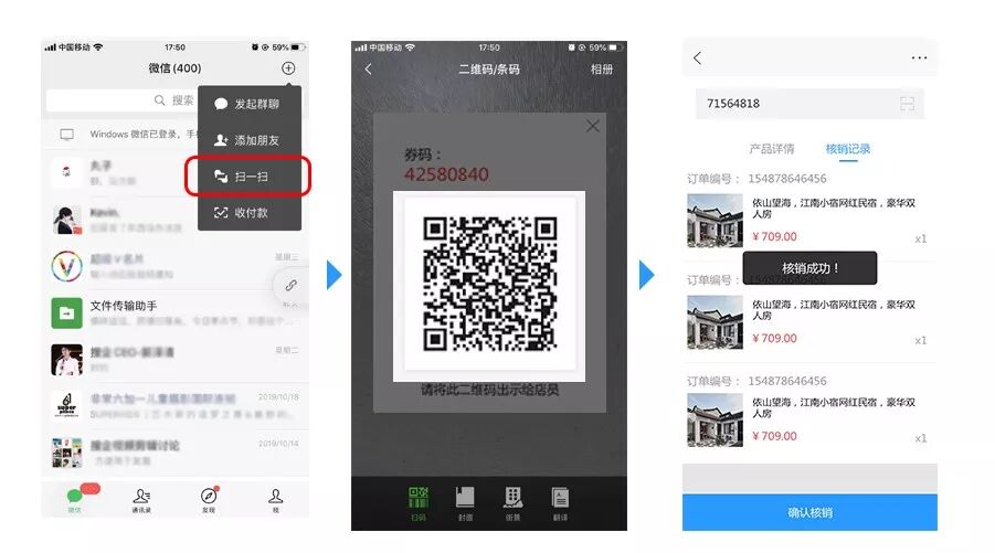 2.微信已绑定卖家名片的情况通过微信界面扫一扫-->直接扫码核销-->完成核销