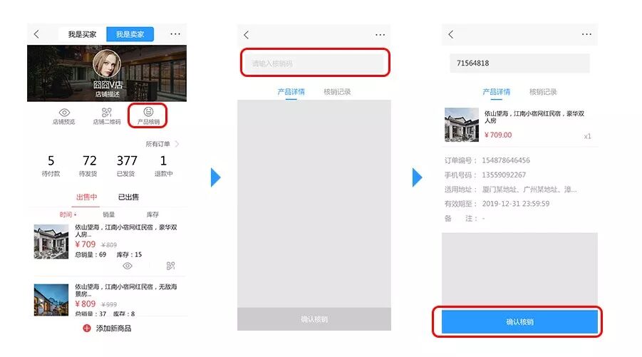 卖家核销指南:1.通过V店卖家界面选择“产品核销”-->输入核销码”-->“确认核销”