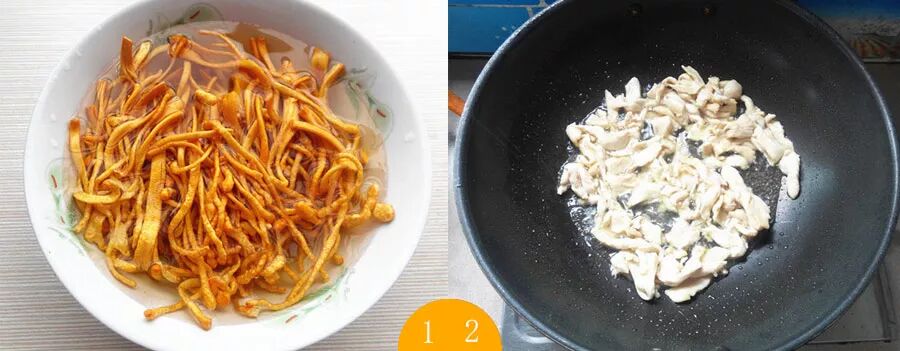 留底油,入小米椒、生姜、蒜头翻炒出香味。加入虫草花,快速翻炒。