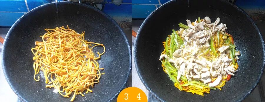 锅中入油,5成热时下腌好的肉片,滑炒到变色捞出。