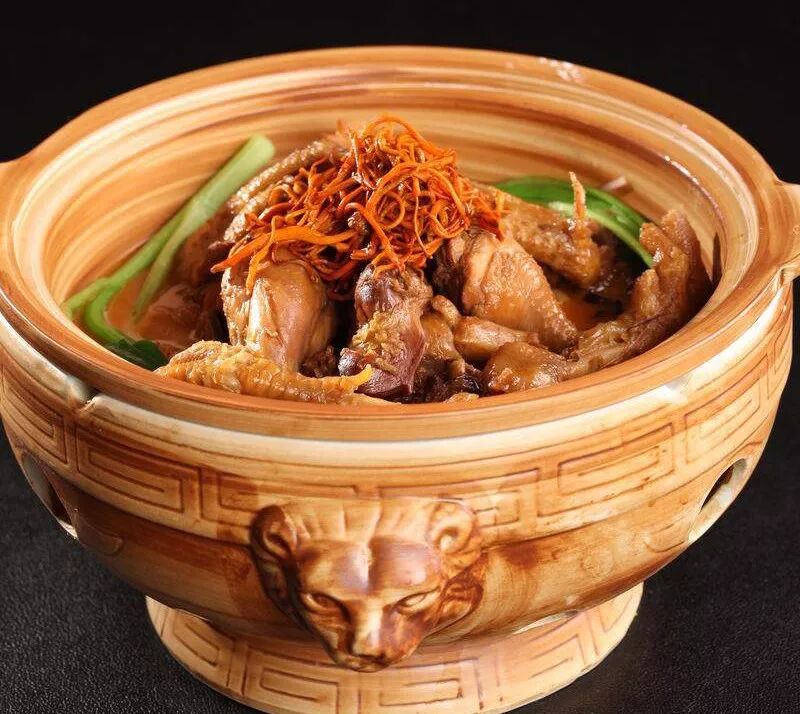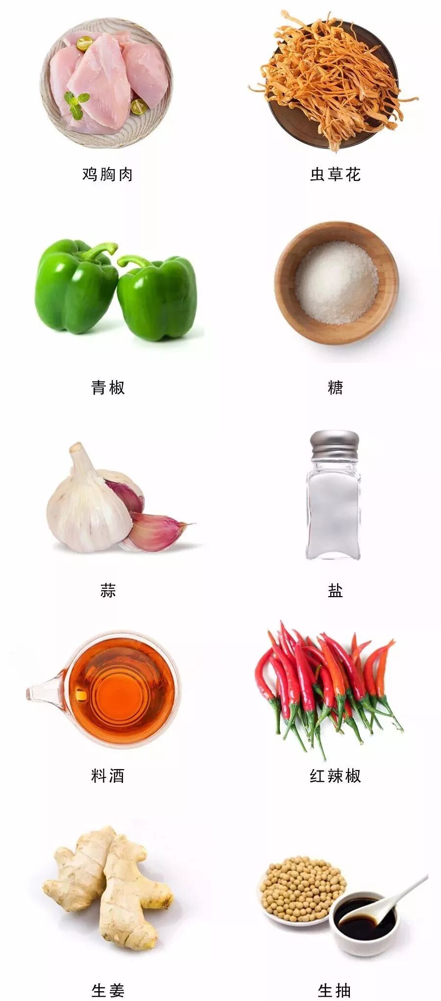 等虫草花出汤后加入青椒、鸡肉、食盐。翻炒均匀就可以出锅了。