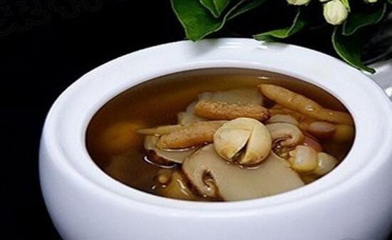 鲍鱼20克,海参40克,清鸡汤1碗半,冬菇20克,桂圆肉10克,虫草5克,绍酒2茶匙。