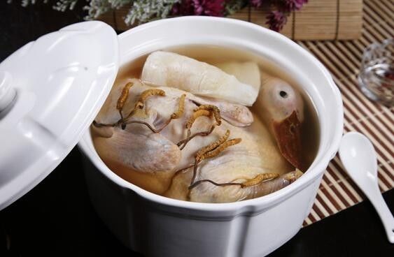 做法:鲫鱼洗净鱼腹,滤干备用,冬虫夏草、肉苁蓉、枸杞、川芎洗净,放入锅中加5杯水,炖约2小时后加入鱼、姜片、盐和酒再炖30分钟。