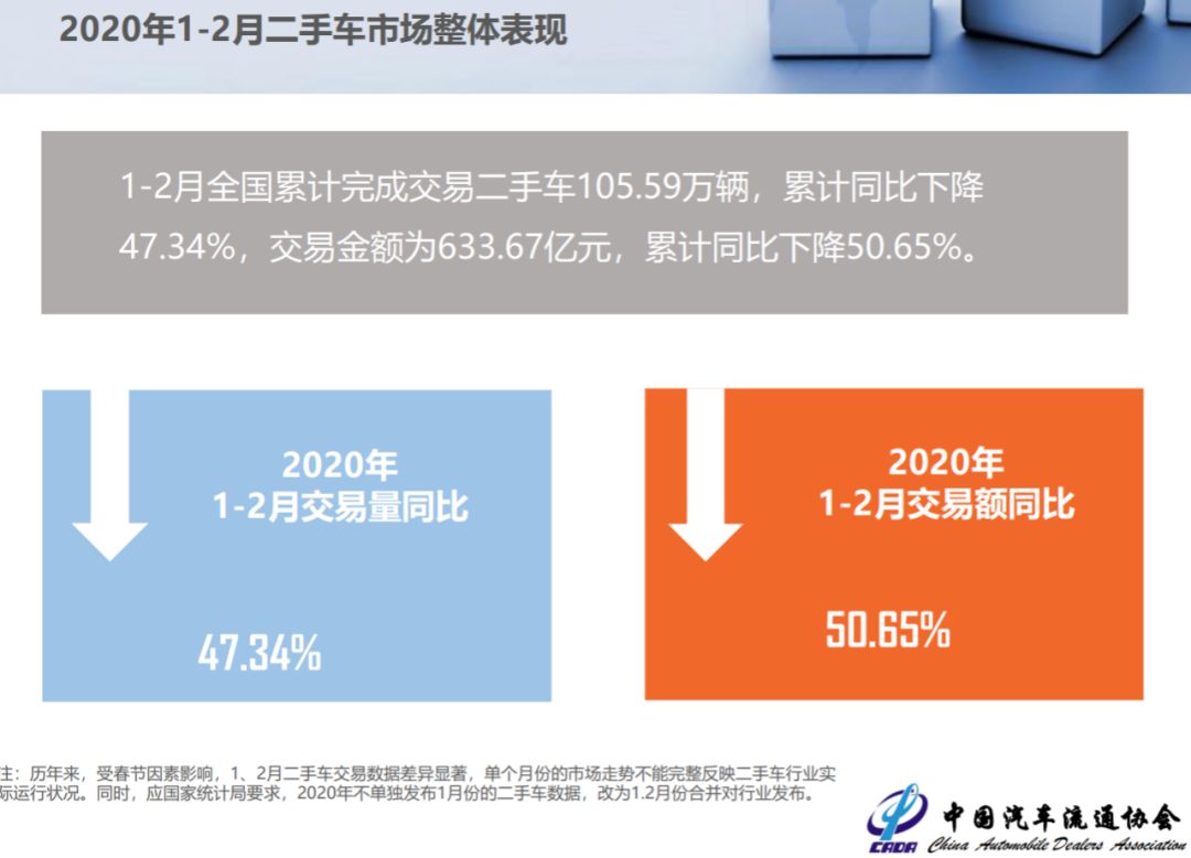 中国汽车流通协会的数据显示,2020年2月,全国二手车市场交易量7.11万辆,交易量环比下降92.78%,月度同比下降91.19%,1-2月份累计完成二手车交易量105.59万辆,同比下降47.34%。