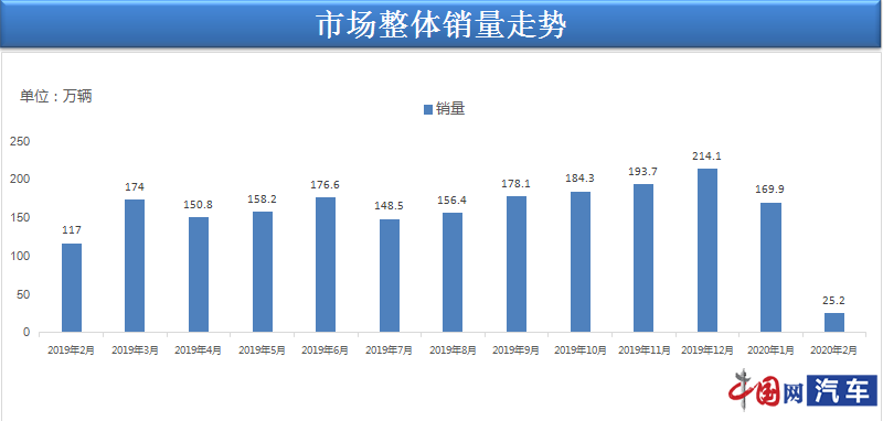 乘年会的最新数据显示,2020年2月全国乘用车市场零售销量25.2万辆,同比下滑了78.5%。乘联会分析称:对比19年2月因春节因素同比下降19%属于超低基数,说明今年疫情影响下的车市严重异常。1-2月零售累计同比下降41.0%,疫情因素的影响远大于春节因素的干扰。