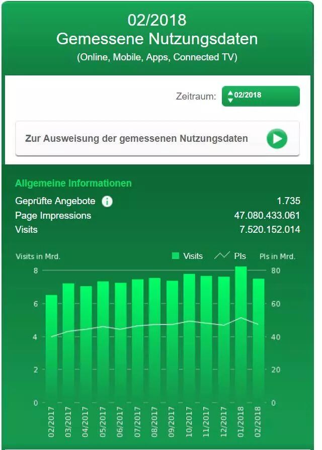 德国权威网络监测机构IVW 2018年2月mobile.de监测结果:1,735份审核报价,访问量75.2亿次。